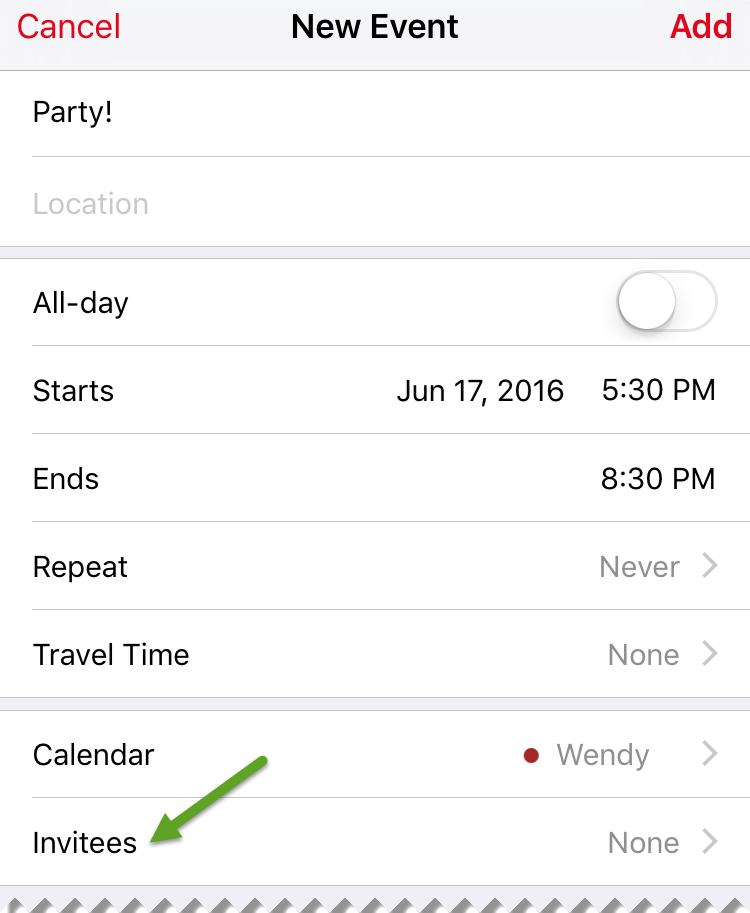 NOTE: If you do not see Invitees, the calendar you have chosen does not support this feature. Most Microsoft Exchange and webmail accounts usually support this feature so try a different calendar if any are available. To use a different calendar, click "Calendar" and select a different calendar from the list of those available.